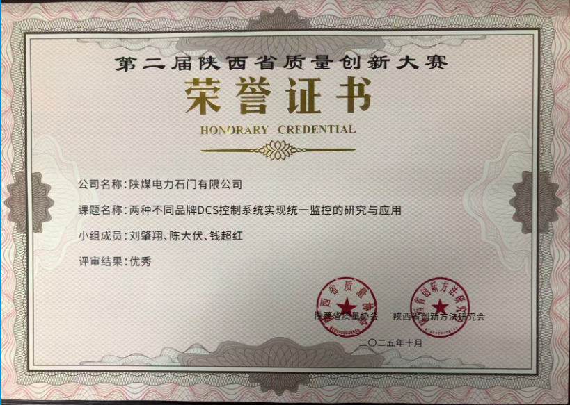 近日,在第二屆陜西省質(zhì)量創(chuàng)新大賽中,陜煤電力石門有限公司申報《兩種不同品牌DCS控制系統(tǒng)實(shí)現(xiàn)統(tǒng)一監(jiān)控的研究與應(yīng)用》榮獲優(yōu)秀獎?!?..